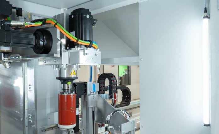 Zum Einsatz kommt eine leistungsoptimierte LED-Maschinenleuchte mit RGB-W-Funktion. Dank ausgeklügeltem Thermomanagement arbeitet die Leuchte zuverlässig bei Umgebungstemperaturen bis zu +70 °C. Neben der homogenen Ausleuchtung mit weißem Licht ermöglicht die RGB-Funktion eine farbliche Signalisierung von Prozesszuständen oder Fertigungsfortschritten.