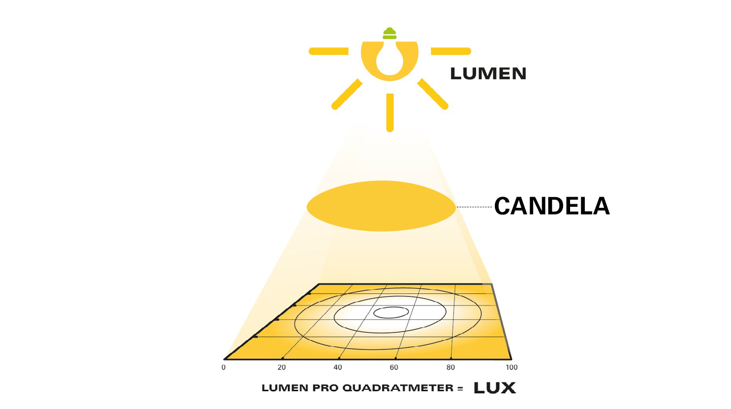 Candela (cd) wiederum ist die Maßeinheit für die Lichtstärke oder Lichtleistung: die Intensität des Lichts in eine bestimmte Richtung. Sie wird vor allem bei der Berechnung der Beleuchtungsstärke in Abhängigkeit von der Entfernung verwendet.