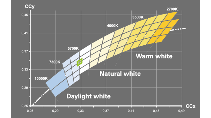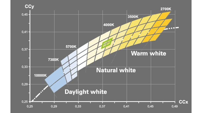 Color temperature (Kelvin), color, luminous flux (lumens), and the required forward voltage can vary within a production run. As a result, LED chips installed in a single fixture may show slight differences. This classification process is known as binning. The chips are sorted into different bins according to how narrow or wide the specified quality parameters are. The larger the bin—or the wider the sorting tolerance—the greater the deviations between the chips. The tighter the binning, the more complex the sorting process becomes, ultimately increasing cost but also improving product quality.