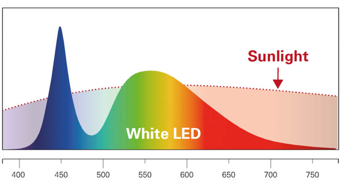 From a physical standpoint, LED chips do not emit white light directly. To generate white light, a blue-emitting LED chip is used, and its light passes through a phosphor layer. This phosphor layer adds the missing spectral components to the blue light, resulting in white light.